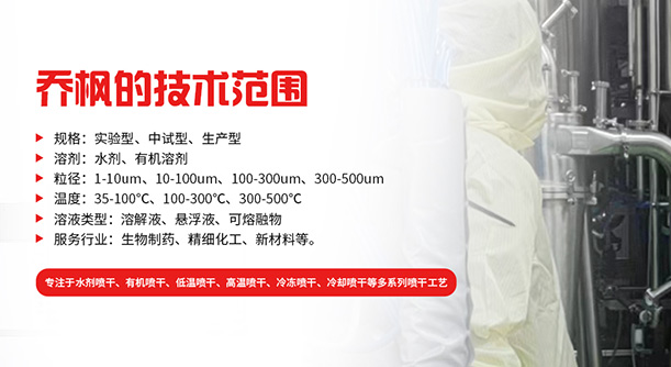 上海喬楓實業有限公司,成立于2012年,是從事噴霧干燥設備的研發設計、生產、銷售(小型噴霧干燥機,實驗型噴霧干燥機35℃低溫噴霧干燥機有機溶劑噴霧干燥機,低溫閉式循環噴霧干燥機、超細粉末噴霧干燥機、噴霧冷凍干燥機真空噴霧干燥機、氣流噴霧干燥機,噴霧造粒干燥機離心噴霧干燥機沸騰制粒機等)和售后于一體的綜合性公司,本公司現成為一家致力于為生物制藥、精細化工、新能源、陶瓷造粒及食品工程等領域提供全套解決方案的整線交鑰匙工程企業。